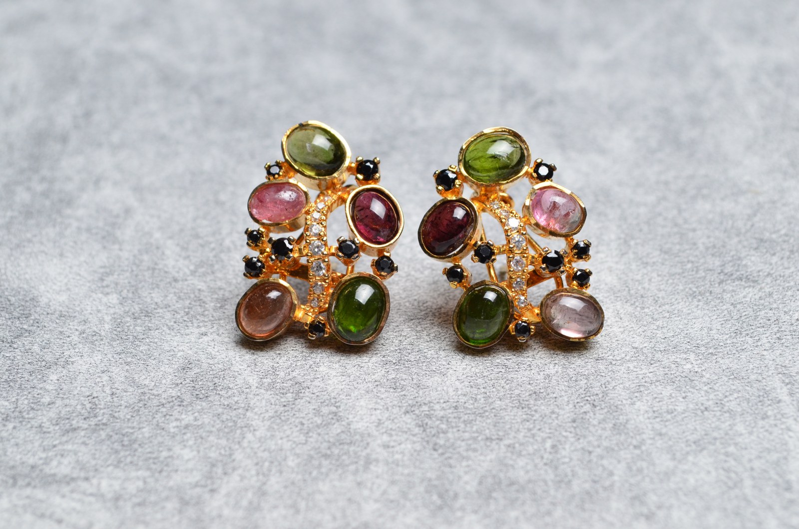 Sterling silver (925) earring gold polish with zircon, black sapphire and different colored tourmaline
