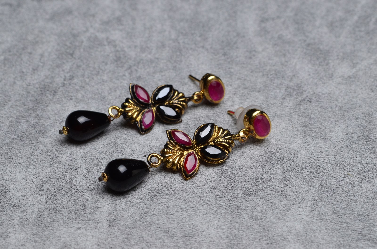 Sterling silver (925) earring gold antique polish with ruby and black onyx.