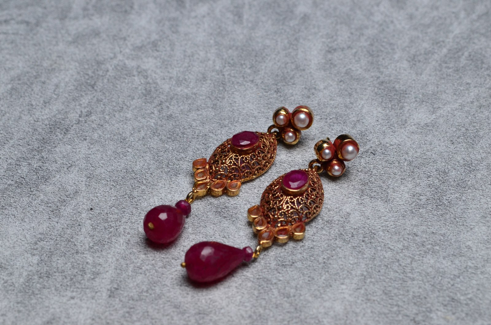 Sterling silver (925) earring gold antique polish with kundan work, ruby and pearl