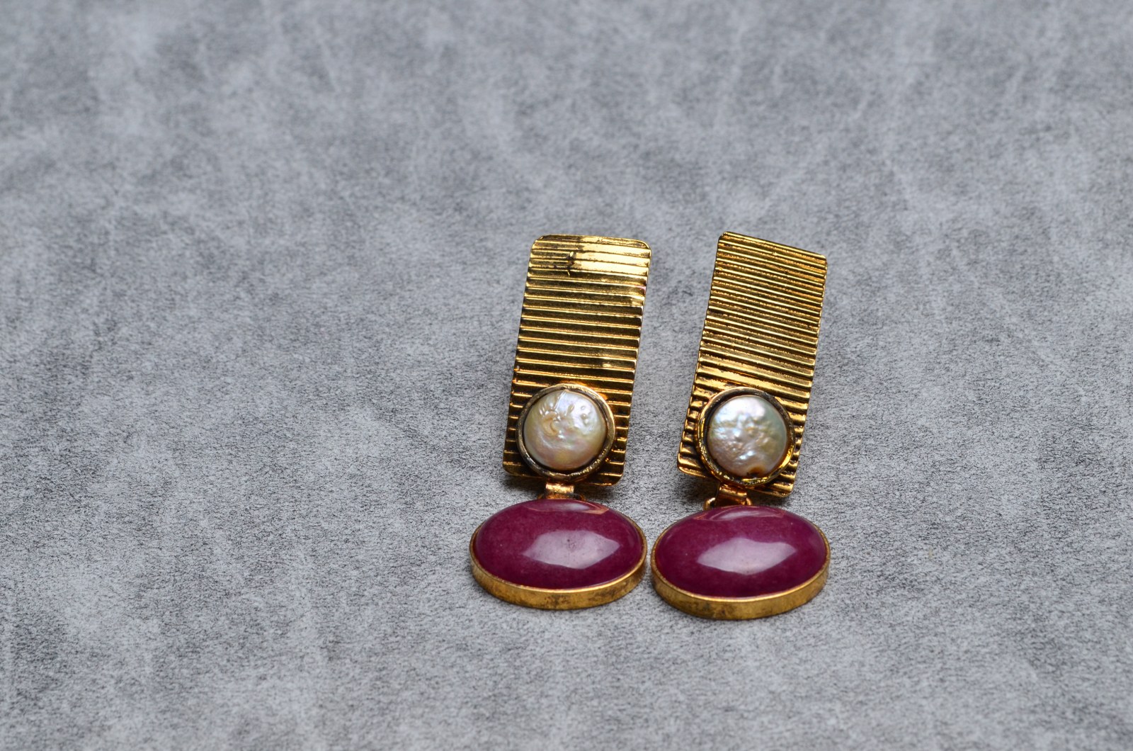 Sterling silver (925) earring gold antique polish with pearl and ruby.
