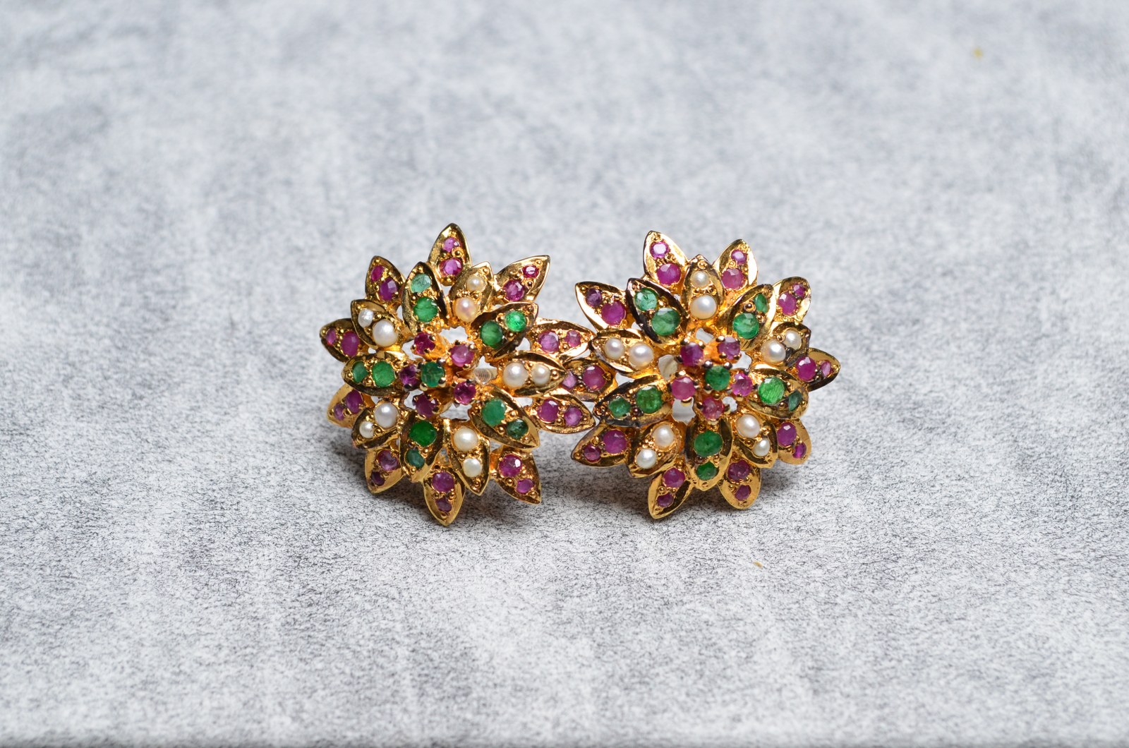 Sterling silver (925) earring gold polish with pearl, ruby and emerald