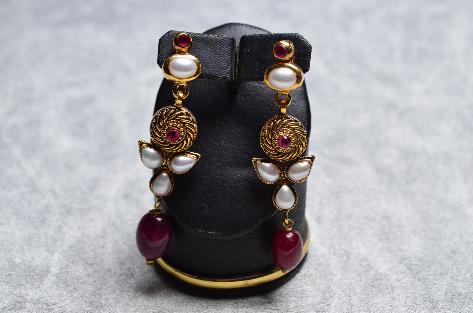 Sterling silver (925) earring gold antique polish with ruby and pearl.